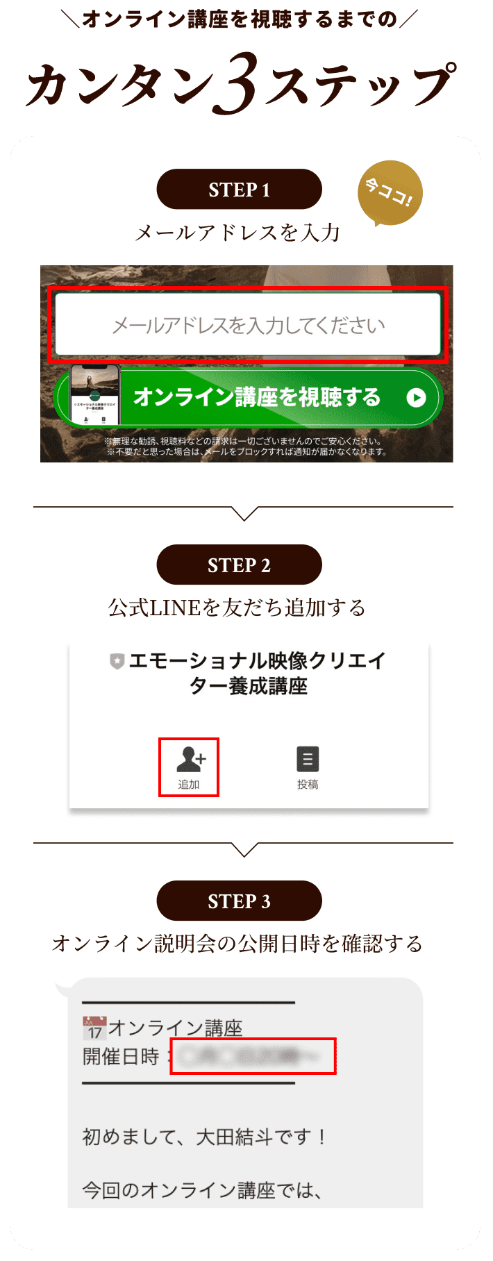 エモーショナル映像クリエイター 養成オンライン講座は完全オンラインにて行います。ページ内の緑色のボタンをクリックし、プログラム専用の公式LINEを登録することで受講できますので是非ご参加ください。